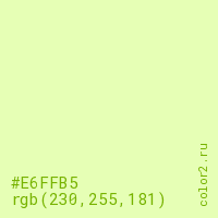 Цвет #E6FFB5 в цветовой модели RGB обозначается тремя октетами (230, 255, 181) в десятичном формате и #E6FFB5 в шестнадцатиричном (hex) формате, которые являются интенсивностью красного 230 (hex E6), интенсивность зелёного 255 (hex FF) и интенсивность синего 181 (hex B5).