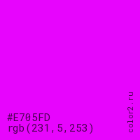 Цвет #E705FD в цветовой модели RGB обозначается тремя октетами (231, 5, 253) в десятичном формате и #E705FD в шестнадцатиричном (hex) формате, которые являются интенсивностью красного 231 (hex E7), интенсивность зелёного 5 (hex 05) и интенсивность синего 253 (hex FD).