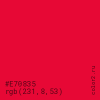 Цвет #E70835 в цветовой модели RGB обозначается тремя октетами (231, 8, 53) в десятичном формате и #E70835 в шестнадцатиричном (hex) формате, которые являются интенсивностью красного 231 (hex E7), интенсивность зелёного 8 (hex 08) и интенсивность синего 53 (hex 35).