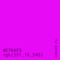 Цвет #E70AF5 в цветовой модели RGB обозначается тремя октетами (231, 10, 245) в десятичном формате и #E70AF5 в шестнадцатиричном (hex) формате, которые являются интенсивностью красного 231 (hex E7), интенсивность зелёного 10 (hex 0A) и интенсивность синего 245 (hex F5).