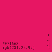 Цвет #E71663 в цветовой модели RGB обозначается тремя октетами (231, 22, 99) в десятичном формате и #E71663 в шестнадцатиричном (hex) формате, которые являются интенсивностью красного 231 (hex E7), интенсивность зелёного 22 (hex 16) и интенсивность синего 99 (hex 63).