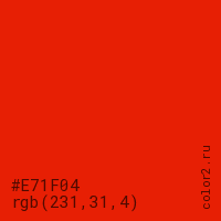 Цвет #E71F04 в цветовой модели RGB обозначается тремя октетами (231, 31, 4) в десятичном формате и #E71F04 в шестнадцатиричном (hex) формате, которые являются интенсивностью красного 231 (hex E7), интенсивность зелёного 31 (hex 1F) и интенсивность синего 4 (hex 04).