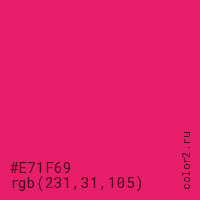 Цвет #E71F69 в цветовой модели RGB обозначается тремя октетами (231, 31, 105) в десятичном формате и #E71F69 в шестнадцатиричном (hex) формате, которые являются интенсивностью красного 231 (hex E7), интенсивность зелёного 31 (hex 1F) и интенсивность синего 105 (hex 69).
