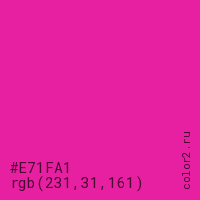 Цвет #E71FA1 в цветовой модели RGB обозначается тремя октетами (231, 31, 161) в десятичном формате и #E71FA1 в шестнадцатиричном (hex) формате, которые являются интенсивностью красного 231 (hex E7), интенсивность зелёного 31 (hex 1F) и интенсивность синего 161 (hex A1).