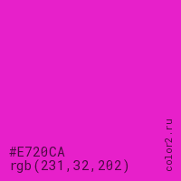 Цвет #E720CA в цветовой модели RGB обозначается тремя октетами (231, 32, 202) в десятичном формате и #E720CA в шестнадцатиричном (hex) формате, которые являются интенсивностью красного 231 (hex E7), интенсивность зелёного 32 (hex 20) и интенсивность синего 202 (hex CA).