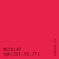 Цвет #E72147 в цветовой модели RGB обозначается тремя октетами (231, 33, 71) в десятичном формате и #E72147 в шестнадцатиричном (hex) формате, которые являются интенсивностью красного 231 (hex E7), интенсивность зелёного 33 (hex 21) и интенсивность синего 71 (hex 47).