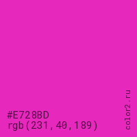 Цвет #E728BD в цветовой модели RGB обозначается тремя октетами (231, 40, 189) в десятичном формате и #E728BD в шестнадцатиричном (hex) формате, которые являются интенсивностью красного 231 (hex E7), интенсивность зелёного 40 (hex 28) и интенсивность синего 189 (hex BD).