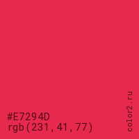 Цвет #E7294D в цветовой модели RGB обозначается тремя октетами (231, 41, 77) в десятичном формате и #E7294D в шестнадцатиричном (hex) формате, которые являются интенсивностью красного 231 (hex E7), интенсивность зелёного 41 (hex 29) и интенсивность синего 77 (hex 4D).