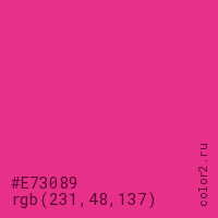 Цвет #E73089 в цветовой модели RGB обозначается тремя октетами (231, 48, 137) в десятичном формате и #E73089 в шестнадцатиричном (hex) формате, которые являются интенсивностью красного 231 (hex E7), интенсивность зелёного 48 (hex 30) и интенсивность синего 137 (hex 89).