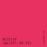 Цвет #E7315F в цветовой модели RGB обозначается тремя октетами (231, 49, 95) в десятичном формате и #E7315F в шестнадцатиричном (hex) формате, которые являются интенсивностью красного 231 (hex E7), интенсивность зелёного 49 (hex 31) и интенсивность синего 95 (hex 5F).