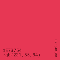 Цвет #E73754 в цветовой модели RGB обозначается тремя октетами (231, 55, 84) в десятичном формате и #E73754 в шестнадцатиричном (hex) формате, которые являются интенсивностью красного 231 (hex E7), интенсивность зелёного 55 (hex 37) и интенсивность синего 84 (hex 54).