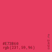 Цвет #E73B60 в цветовой модели RGB обозначается тремя октетами (231, 59, 96) в десятичном формате и #E73B60 в шестнадцатиричном (hex) формате, которые являются интенсивностью красного 231 (hex E7), интенсивность зелёного 59 (hex 3B) и интенсивность синего 96 (hex 60).