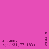 Цвет #E74DB7 в цветовой модели RGB обозначается тремя октетами (231, 77, 183) в десятичном формате и #E74DB7 в шестнадцатиричном (hex) формате, которые являются интенсивностью красного 231 (hex E7), интенсивность зелёного 77 (hex 4D) и интенсивность синего 183 (hex B7).
