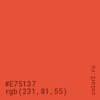 Цвет #E75137 в цветовой модели RGB обозначается тремя октетами (231, 81, 55) в десятичном формате и #E75137 в шестнадцатиричном (hex) формате, которые являются интенсивностью красного 231 (hex E7), интенсивность зелёного 81 (hex 51) и интенсивность синего 55 (hex 37).