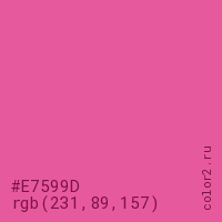 Цвет #E7599D в цветовой модели RGB обозначается тремя октетами (231, 89, 157) в десятичном формате и #E7599D в шестнадцатиричном (hex) формате, которые являются интенсивностью красного 231 (hex E7), интенсивность зелёного 89 (hex 59) и интенсивность синего 157 (hex 9D).