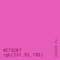 Цвет #E75CB7 в цветовой модели RGB обозначается тремя октетами (231, 92, 183) в десятичном формате и #E75CB7 в шестнадцатиричном (hex) формате, которые являются интенсивностью красного 231 (hex E7), интенсивность зелёного 92 (hex 5C) и интенсивность синего 183 (hex B7).