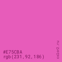 Цвет #E75CBA в цветовой модели RGB обозначается тремя октетами (231, 92, 186) в десятичном формате и #E75CBA в шестнадцатиричном (hex) формате, которые являются интенсивностью красного 231 (hex E7), интенсивность зелёного 92 (hex 5C) и интенсивность синего 186 (hex BA).