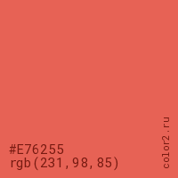 Цвет #E76255 в цветовой модели RGB обозначается тремя октетами (231, 98, 85) в десятичном формате и #E76255 в шестнадцатиричном (hex) формате, которые являются интенсивностью красного 231 (hex E7), интенсивность зелёного 98 (hex 62) и интенсивность синего 85 (hex 55).
