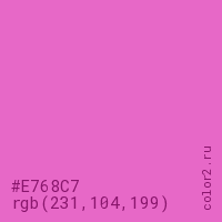 Цвет #E768C7 в цветовой модели RGB обозначается тремя октетами (231, 104, 199) в десятичном формате и #E768C7 в шестнадцатиричном (hex) формате, которые являются интенсивностью красного 231 (hex E7), интенсивность зелёного 104 (hex 68) и интенсивность синего 199 (hex C7).