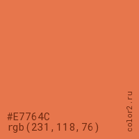 Цвет #E7764C в цветовой модели RGB обозначается тремя октетами (231, 118, 76) в десятичном формате и #E7764C в шестнадцатиричном (hex) формате, которые являются интенсивностью красного 231 (hex E7), интенсивность зелёного 118 (hex 76) и интенсивность синего 76 (hex 4C).