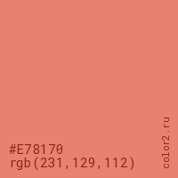 Цвет #E78170 в цветовой модели RGB обозначается тремя октетами (231, 129, 112) в десятичном формате и #E78170 в шестнадцатиричном (hex) формате, которые являются интенсивностью красного 231 (hex E7), интенсивность зелёного 129 (hex 81) и интенсивность синего 112 (hex 70).