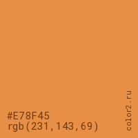 Цвет #E78F45 в цветовой модели RGB обозначается тремя октетами (231, 143, 69) в десятичном формате и #E78F45 в шестнадцатиричном (hex) формате, которые являются интенсивностью красного 231 (hex E7), интенсивность зелёного 143 (hex 8F) и интенсивность синего 69 (hex 45).