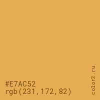 Цвет #E7AC52 в цветовой модели RGB обозначается тремя октетами (231, 172, 82) в десятичном формате и #E7AC52 в шестнадцатиричном (hex) формате, которые являются интенсивностью красного 231 (hex E7), интенсивность зелёного 172 (hex AC) и интенсивность синего 82 (hex 52).