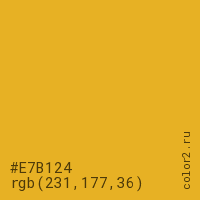 Цвет #E7B124 в цветовой модели RGB обозначается тремя октетами (231, 177, 36) в десятичном формате и #E7B124 в шестнадцатиричном (hex) формате, которые являются интенсивностью красного 231 (hex E7), интенсивность зелёного 177 (hex B1) и интенсивность синего 36 (hex 24).