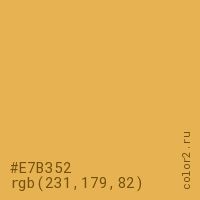 Цвет #E7B352 в цветовой модели RGB обозначается тремя октетами (231, 179, 82) в десятичном формате и #E7B352 в шестнадцатиричном (hex) формате, которые являются интенсивностью красного 231 (hex E7), интенсивность зелёного 179 (hex B3) и интенсивность синего 82 (hex 52).