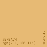 Цвет #E7BA74 в цветовой модели RGB обозначается тремя октетами (231, 186, 116) в десятичном формате и #E7BA74 в шестнадцатиричном (hex) формате, которые являются интенсивностью красного 231 (hex E7), интенсивность зелёного 186 (hex BA) и интенсивность синего 116 (hex 74).