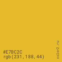 Цвет #E7BC2C в цветовой модели RGB обозначается тремя октетами (231, 188, 44) в десятичном формате и #E7BC2C в шестнадцатиричном (hex) формате, которые являются интенсивностью красного 231 (hex E7), интенсивность зелёного 188 (hex BC) и интенсивность синего 44 (hex 2C).