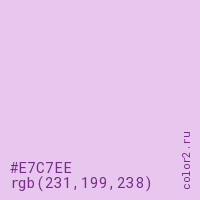Цвет #E7C7EE в цветовой модели RGB обозначается тремя октетами (231, 199, 238) в десятичном формате и #E7C7EE в шестнадцатиричном (hex) формате, которые являются интенсивностью красного 231 (hex E7), интенсивность зелёного 199 (hex C7) и интенсивность синего 238 (hex EE).