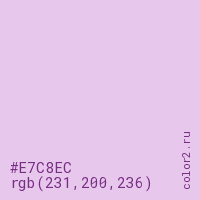 Цвет #E7C8EC в цветовой модели RGB обозначается тремя октетами (231, 200, 236) в десятичном формате и #E7C8EC в шестнадцатиричном (hex) формате, которые являются интенсивностью красного 231 (hex E7), интенсивность зелёного 200 (hex C8) и интенсивность синего 236 (hex EC).