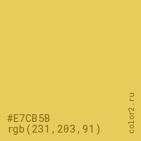 Цвет #E7CB5B в цветовой модели RGB обозначается тремя октетами (231, 203, 91) в десятичном формате и #E7CB5B в шестнадцатиричном (hex) формате, которые являются интенсивностью красного 231 (hex E7), интенсивность зелёного 203 (hex CB) и интенсивность синего 91 (hex 5B).