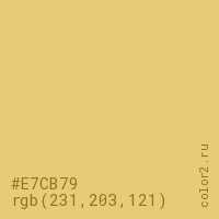 Цвет #E7CB79 в цветовой модели RGB обозначается тремя октетами (231, 203, 121) в десятичном формате и #E7CB79 в шестнадцатиричном (hex) формате, которые являются интенсивностью красного 231 (hex E7), интенсивность зелёного 203 (hex CB) и интенсивность синего 121 (hex 79).