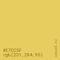 Цвет #E7CC5F в цветовой модели RGB обозначается тремя октетами (231, 204, 95) в десятичном формате и #E7CC5F в шестнадцатиричном (hex) формате, которые являются интенсивностью красного 231 (hex E7), интенсивность зелёного 204 (hex CC) и интенсивность синего 95 (hex 5F).