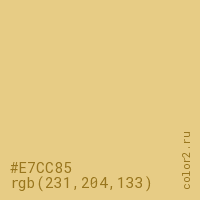 Цвет #E7CC85 в цветовой модели RGB обозначается тремя октетами (231, 204, 133) в десятичном формате и #E7CC85 в шестнадцатиричном (hex) формате, которые являются интенсивностью красного 231 (hex E7), интенсивность зелёного 204 (hex CC) и интенсивность синего 133 (hex 85).
