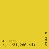 Цвет #E7CE2C в цветовой модели RGB обозначается тремя октетами (231, 206, 44) в десятичном формате и #E7CE2C в шестнадцатиричном (hex) формате, которые являются интенсивностью красного 231 (hex E7), интенсивность зелёного 206 (hex CE) и интенсивность синего 44 (hex 2C).