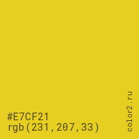 Цвет #E7CF21 в цветовой модели RGB обозначается тремя октетами (231, 207, 33) в десятичном формате и #E7CF21 в шестнадцатиричном (hex) формате, которые являются интенсивностью красного 231 (hex E7), интенсивность зелёного 207 (hex CF) и интенсивность синего 33 (hex 21).