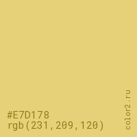 Цвет #E7D178 в цветовой модели RGB обозначается тремя октетами (231, 209, 120) в десятичном формате и #E7D178 в шестнадцатиричном (hex) формате, которые являются интенсивностью красного 231 (hex E7), интенсивность зелёного 209 (hex D1) и интенсивность синего 120 (hex 78).