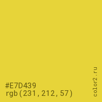 Цвет #E7D439 в цветовой модели RGB обозначается тремя октетами (231, 212, 57) в десятичном формате и #E7D439 в шестнадцатиричном (hex) формате, которые являются интенсивностью красного 231 (hex E7), интенсивность зелёного 212 (hex D4) и интенсивность синего 57 (hex 39).