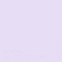 Цвет #E7DDF5 в цветовой модели RGB обозначается тремя октетами (231, 221, 245) в десятичном формате и #E7DDF5 в шестнадцатиричном (hex) формате, которые являются интенсивностью красного 231 (hex E7), интенсивность зелёного 221 (hex DD) и интенсивность синего 245 (hex F5).