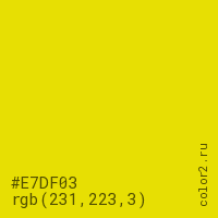 Цвет #E7DF03 в цветовой модели RGB обозначается тремя октетами (231, 223, 3) в десятичном формате и #E7DF03 в шестнадцатиричном (hex) формате, которые являются интенсивностью красного 231 (hex E7), интенсивность зелёного 223 (hex DF) и интенсивность синего 3 (hex 03).
