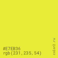 Цвет #E7EB36 в цветовой модели RGB обозначается тремя октетами (231, 235, 54) в десятичном формате и #E7EB36 в шестнадцатиричном (hex) формате, которые являются интенсивностью красного 231 (hex E7), интенсивность зелёного 235 (hex EB) и интенсивность синего 54 (hex 36).