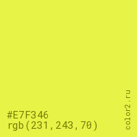Цвет #E7F346 в цветовой модели RGB обозначается тремя октетами (231, 243, 70) в десятичном формате и #E7F346 в шестнадцатиричном (hex) формате, которые являются интенсивностью красного 231 (hex E7), интенсивность зелёного 243 (hex F3) и интенсивность синего 70 (hex 46).