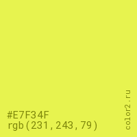 Цвет #E7F34F в цветовой модели RGB обозначается тремя октетами (231, 243, 79) в десятичном формате и #E7F34F в шестнадцатиричном (hex) формате, которые являются интенсивностью красного 231 (hex E7), интенсивность зелёного 243 (hex F3) и интенсивность синего 79 (hex 4F).