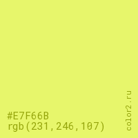Цвет #E7F66B в цветовой модели RGB обозначается тремя октетами (231, 246, 107) в десятичном формате и #E7F66B в шестнадцатиричном (hex) формате, которые являются интенсивностью красного 231 (hex E7), интенсивность зелёного 246 (hex F6) и интенсивность синего 107 (hex 6B).