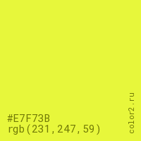 Цвет #E7F73B в цветовой модели RGB обозначается тремя октетами (231, 247, 59) в десятичном формате и #E7F73B в шестнадцатиричном (hex) формате, которые являются интенсивностью красного 231 (hex E7), интенсивность зелёного 247 (hex F7) и интенсивность синего 59 (hex 3B).
