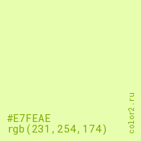 Цвет #E7FEAE в цветовой модели RGB обозначается тремя октетами (231, 254, 174) в десятичном формате и #E7FEAE в шестнадцатиричном (hex) формате, которые являются интенсивностью красного 231 (hex E7), интенсивность зелёного 254 (hex FE) и интенсивность синего 174 (hex AE).