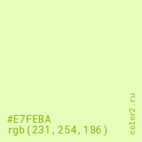 Цвет #E7FEBA в цветовой модели RGB обозначается тремя октетами (231, 254, 186) в десятичном формате и #E7FEBA в шестнадцатиричном (hex) формате, которые являются интенсивностью красного 231 (hex E7), интенсивность зелёного 254 (hex FE) и интенсивность синего 186 (hex BA).